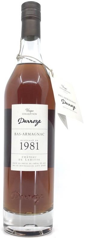 Darroze 1981 Chateau de Lahitte je super-prémiový armagnac z kolekce Unique Collection. Ta je v mnoha ohledech unikátní. Stáčení probíhá na základě objednávky a stáří je tedy určeno datem lahvování. Nikdy však není kratší než 15 let. Jedná se o tzv. „single cask vintage“ armagnac. Armagnac z kolekce Unique je vždy pouze z jednoho sudu a plněn v sudové síle bez dalších úprav. Každý ročník pak pochází z jiného vinařství, kterých má rodina Darroze k dispozici přes 30. Bas Armagnac Darroze 1981 Chateau de Lahitte potěší opravdové znalce i ty, kdo armagnac teprve objevují.