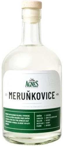 Agnes meruňkovice je 100% ovocný destilát, bez přídavku průmyslově vyráběného lihu a jiných umělých látek. Dlouholetá tradice praví, že právě z lahodných meruněk se dá v našich krajích vyrobit vůbec ten nejlepší a nejjemnější ovocný destilát. I v Agnes znají tajemství výroby dokonalé meruňkovice, ukryté v těch nejlepších odrůdách nejvyšší jakosti bez jakéhokoliv kazu, a řídí se jím. Typické jemné meruňkové aroma je při kvašení a destilaci velmi citlivé, proto bedlivě dbáme na to, aby naše meruňkovice během výroby nedostala žádnou nežádoucí příchuť.