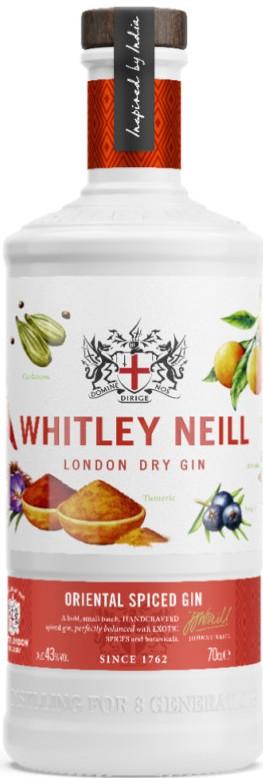 Whitley Neill London Dry Oriental Spiced Gin inspirovaný cestami Johnnyho Neilla na indický kontinent je destilován se zaměřením na exotické chutě a vůně Orientu. Bohatá, voňavá vůně koriandru, kubéby a kardamomu přechází do jalovce a svěží citrusové kůry. Jalovec je doplněn hřejivým, jemným kardamomem s jasně sladkými citrusy, které dodávají šťavnatý charakter, následovaný tóny kmínu vedoucími k zázvorovým a pepřovým tónům.