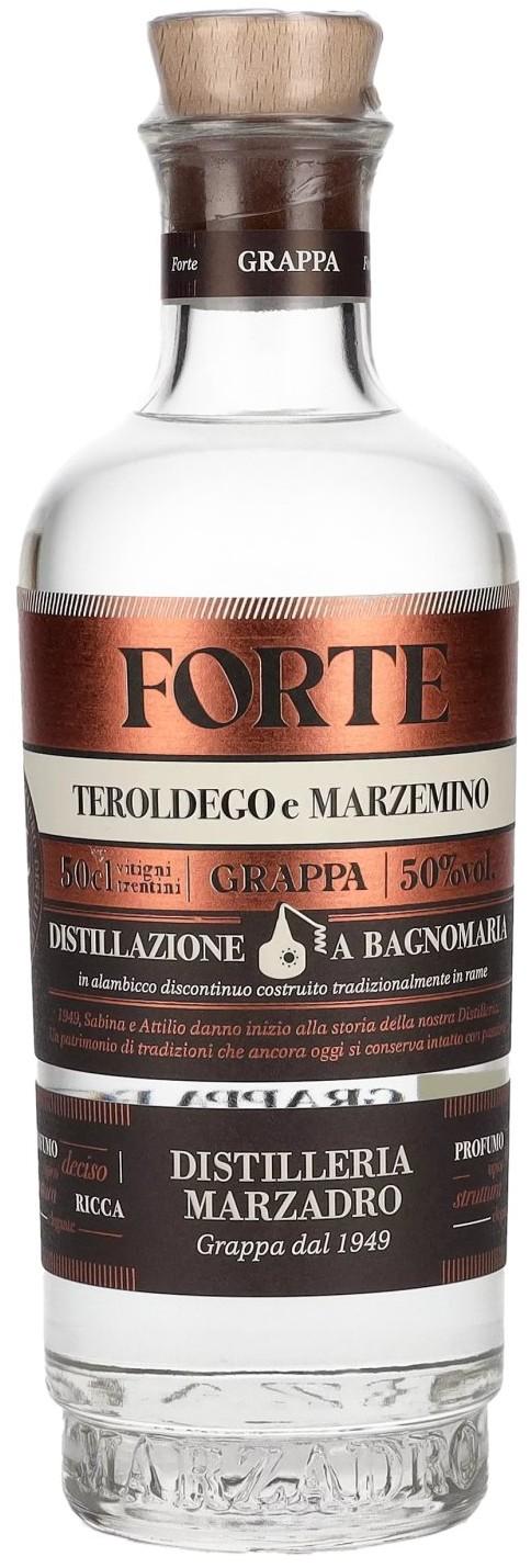 MARZADRO Bivitigno Grappa „Forte“ získaná z hroznů dvou původních červených odrůd Teroldego a Marzemino z Trentina. Destilace probíhá pomalu metodou bain-marie v diskontinuálním parním destilačním zařízení. Tento způsob destilace zachovává všechny aromatické látky vinné révy a zaručuje nejlepší výsledky, pokud jde o vůni a aroma.