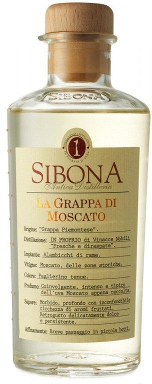 Sibona Moscato grappa je vyráběna z hroznů odrůdy Moscato, pocházejících ze dvou oblastí - Alba a Asti. Tato grappa je čiré slámové barvy s intenzivní a osobitou vůní. Má jemnou hlubokou chuť s bohatým ovocným aroma. Nasládlá příchuť s příjemným závěrem.