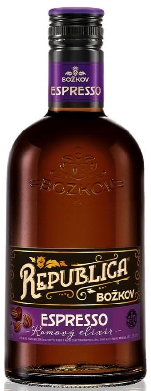 Božkov Republica Elixir Espresso je spojením karibského rumu a kávy Arabica. Guatemalská káva, typická jemnější, ovocnější, intenzivnější a plnou chutí, společně s nasládlými až 8letými karibskými rumy, ve kterých vynikají tóny vanilky, sušeného exotického ovoce a oříšků, přináší do rumového světa výjimečný chuťový zážitek. Božkov Republica Espresso je charakteristická vůní a chuťovými tóny čerstvě připravené kávy arabica doplněnými o ořechově hnědou barvu. Rumový elixír Republica si můžete vychutnat samotný při pokojové teplotě nebo v kombinaci s tonicem a citronem na ledu.