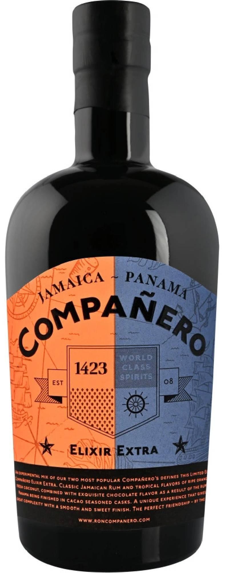 Ron Compañero Elixir Extra - pomeranč potkává čokoládu. Experimentální mix dvou nejoblíbenějších rumů Compañero definuje tuto limitovanou edici – Compañero Elixir Extra. Klasický jamajský rum a tropické příchutě zralých pomerančů a čerstvého kokosu v kombinaci s vynikající čokoládovou příchutí díky úpravě rumu z Panamy v kakaem ochucených sudech. Jedinečný zážitek, který vám poskytne velkou komplexnost s hladkým a sladkým závěrem. Dokonalé přátelství - v lahvi.