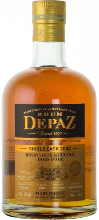 Mandlově zlatá barva s mahagonovým tónem. Vyzrálá , jemná a komplexní vůně. Chuť je vyvážená, jemně dubové tóny s náznaky tmavé čokolády, koření, sušeného ovoce, kávy a vanilky. Na závěr lehká vůně jasmínu, černého čaje a elegantní nádech santalového dřeva. Destilován pouze z cukrové třtiny sklizené v roce 2003, což byl výjimečně slunný rok. Tento rum zraje ve vybraných dubových sudech nejméně jedenáct let. Každá láhev rumu Depaz Single Cask 2003 pochází z jednoho sudu, který vybral master distiller. Výborně se hodí k dobrému doutníku.