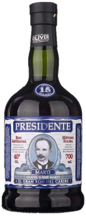 Nejlepší suroviny, čerstvá šťáva z cukrové třtiny, poctivá práce a vášeň pro ty nejlepší rumy. Výsledek? Rum Presidente 15 Anos. Hnědý s jemnou vůní dřeva a čokolády a komplexní nasládlou chutí, jež se hodí do koktejlu i k samotnému popíjení. Byl kubánským národním hrdinou, slavným básníkem a také inspirací pro tvůrce solera rumu Presidente 15 Anos. Jmenoval se José Martí. Hnědý rum pochází z Dominikánské republiky a jeho barva je tmavá, hnědočervená, mahagonová. Vůně je příjemně jemná, jen lehce dřevitá – odkazující na patnáct let, které rum strávil v sudech po burbonu. Je v ní lehce cítit čokoláda, a poté také hnědý cukr a karamel. Chuť je na začátku příjemně sladká, karamelová, poté se přidává nádech vanilky a závěr je čokoládový.
