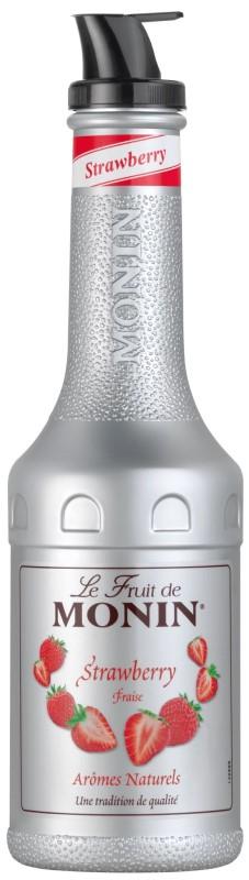 Monin puree fruit Strawberry je vyrobeno ze zralých jahod s minimálním obsahem 50% ovocné složky. Jahoda je prvním ovocem jara. Všichni se těší na konec zimy a tuto sladkou, lahodnou chuť. Oblíbené po celém světě, vynikající jahody se konzumují čerstvé, nebo mohou být zpracovány do džusů, dezertů, marmelád, vína, či sirupů. Jahodové puree Monin má tmavou rubínově červenou barvu s měděnými odlesky. Silné aroma středomořských, zralých jahod. Osvěžující chuť šťavnatých jahod s kyselkavými tóny. Přírodní chuť a dokonalý vzhled je podpořen jahodovými semínky. Použití: smoothies, alko i nealko koktejly, ledové čaje, pokrmy.