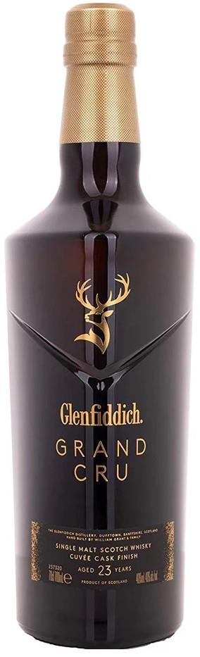 Exkluzivní vydání skotské single malt whisky Glenfiddich Grand Cru, která zrála dlouhých 23 let v amerických a evropských dubových sudech. Zrání však elegantně završila dodatečnými 4 měsíci v raritních sudech po francouzském cuvée. Whisky Glenfiddich Grand Cru 23 Y.O. v sobě díky umění experimentace spojuje nejznamenitější chutě Skotska a Francie. Vyniká tóny santalového dřeva, sladkých briošek a hruškového sorbetu. Je to whisky, která dokonale podtrhuje výjimečné momenty, které chcete oslavit a přináší zcela nový chuťový zážitek.