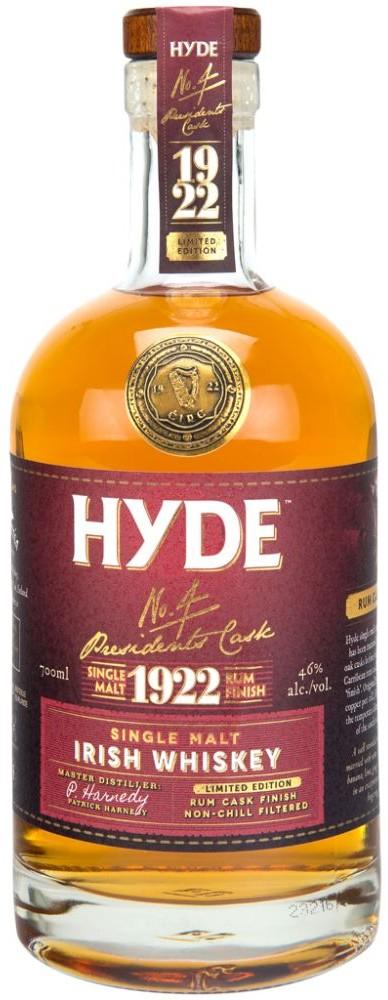 Irská Single Malt whiskey Hyde NO.4 je vyrobena ze 100 % sladového irského ječmene. Tato whiskey je třikrát destilována v malých dávkách tradiční kotlíkovou metodou. Zraje v sudech po výběrovém bourbonu po dobu 6 let a následně dozrává 6 měsíců v sudech po tmavém karibském rumu z Barbadosu, který výsledné whiskey předává úžasné kořeněné tóny s nezaměnitelným aroma a chutí.
