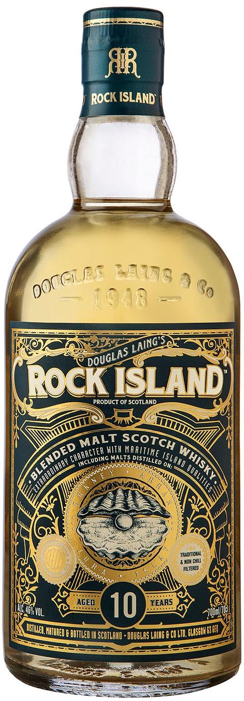 Blended malt whisky od Douglas Laing, Rock Island 10 Year Old kombinuje whisky z ostrova Islay, Arran, Orkney a Jura. Chuť zahrnuje tóny uhlíků, lehký kouř, pomerančovou kůru a mořskou sůl.